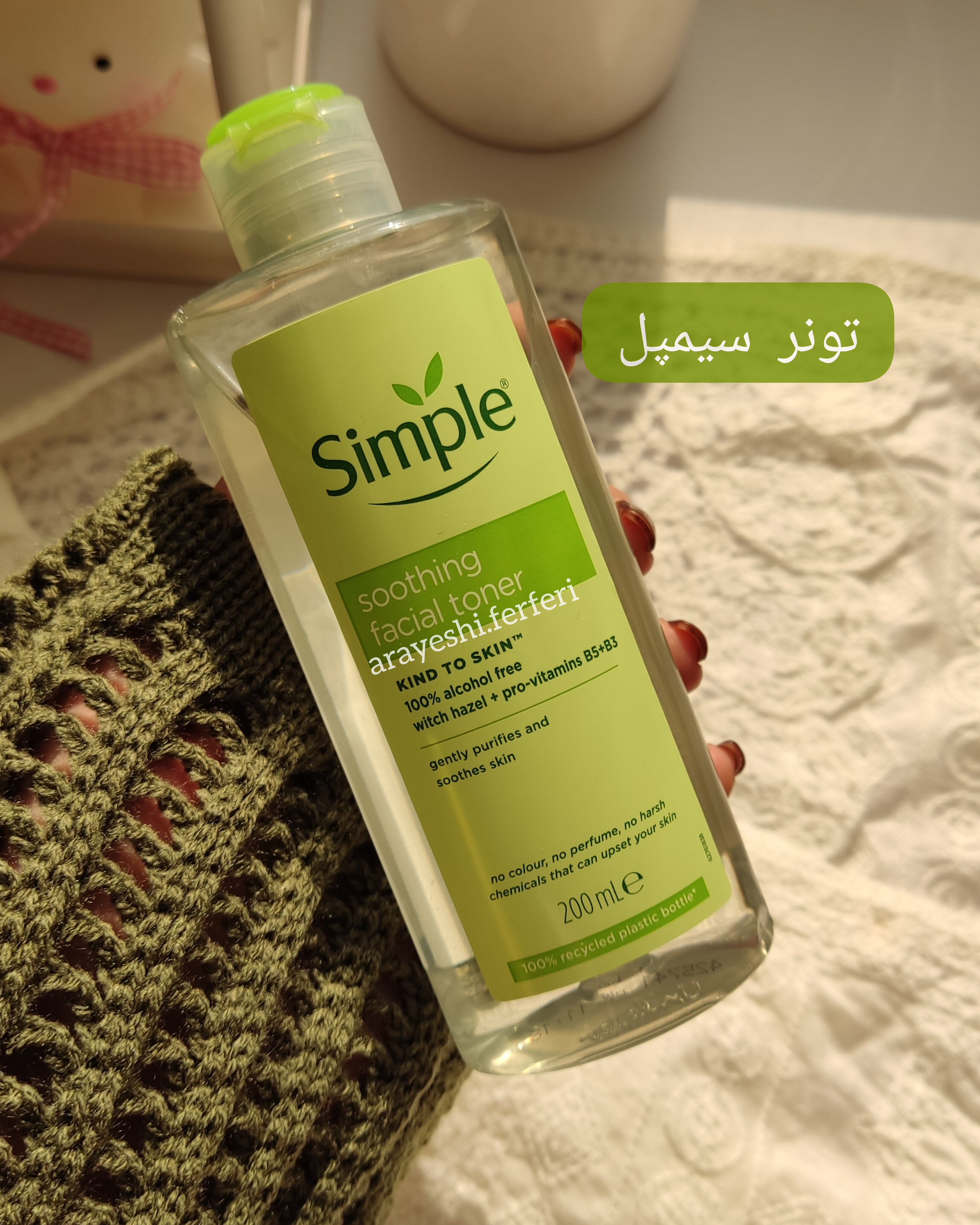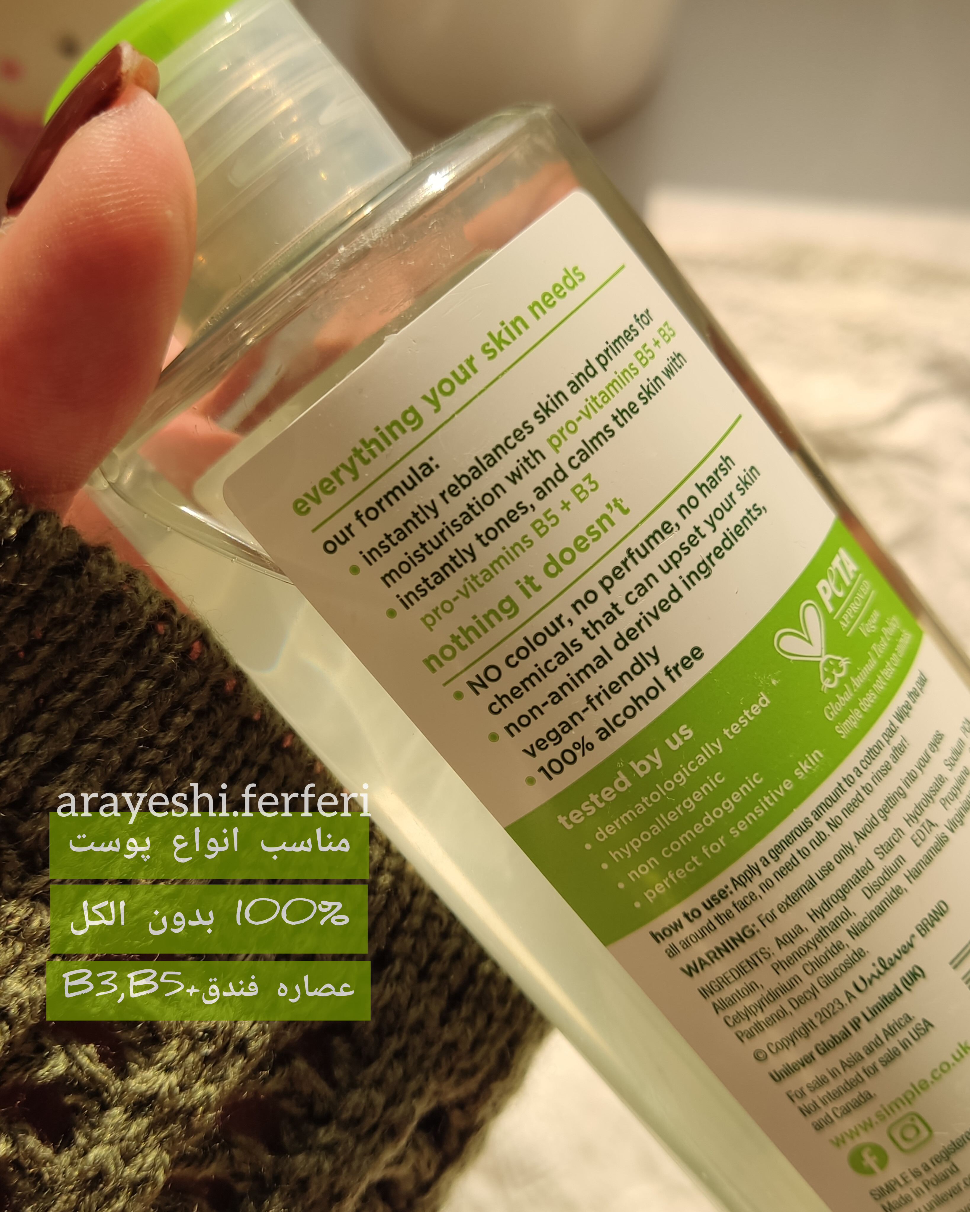 ✔️تونر سیمپل بر پایه آب ، با حذف باقیمانده مواد آرایشی و آلودگیها از روی پوست باعث پاکسازی عمیق منافذ میشه! و برای افزایش شفافیت پوست هم خیلی مفیده🫰🏻💚